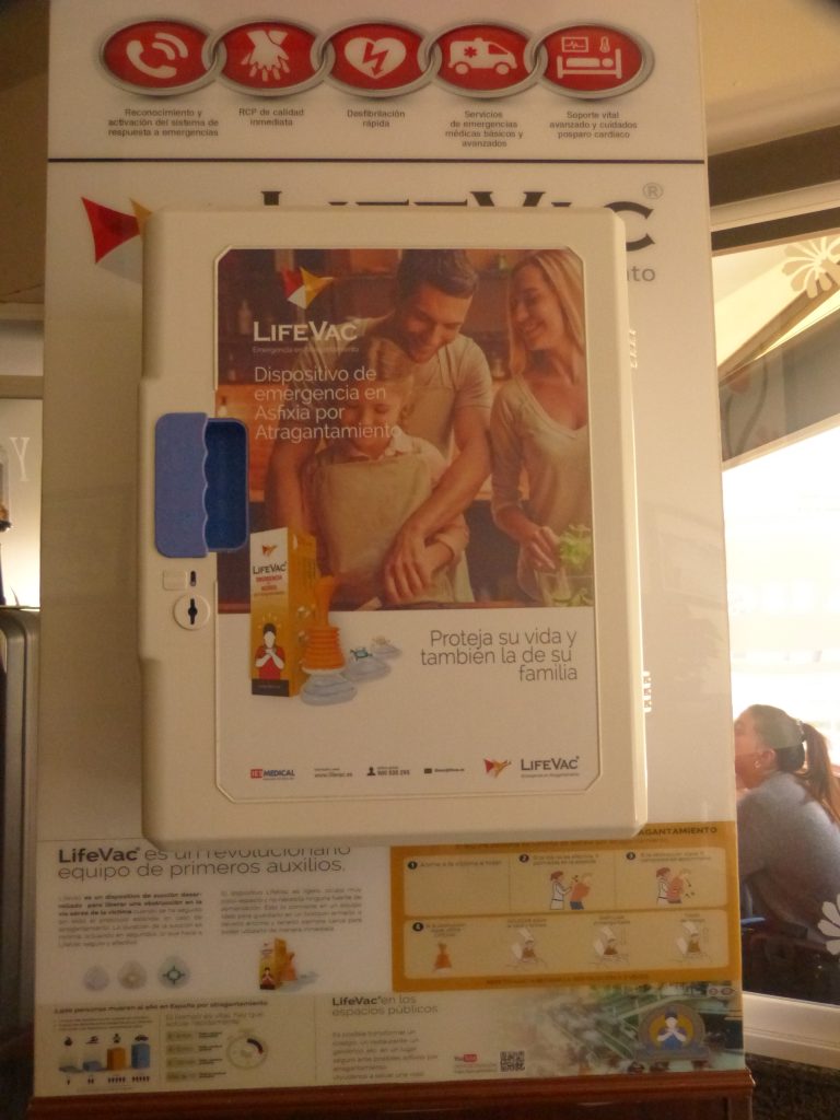 One interesting aspect was also the fact that, as public space, the establishment did not only have a defribillator on a prominent place on the wall, but also an emergency device in case anyone chokes! It seems that choking is, after car crashes, the second highest cause of accident deaths in Spain…